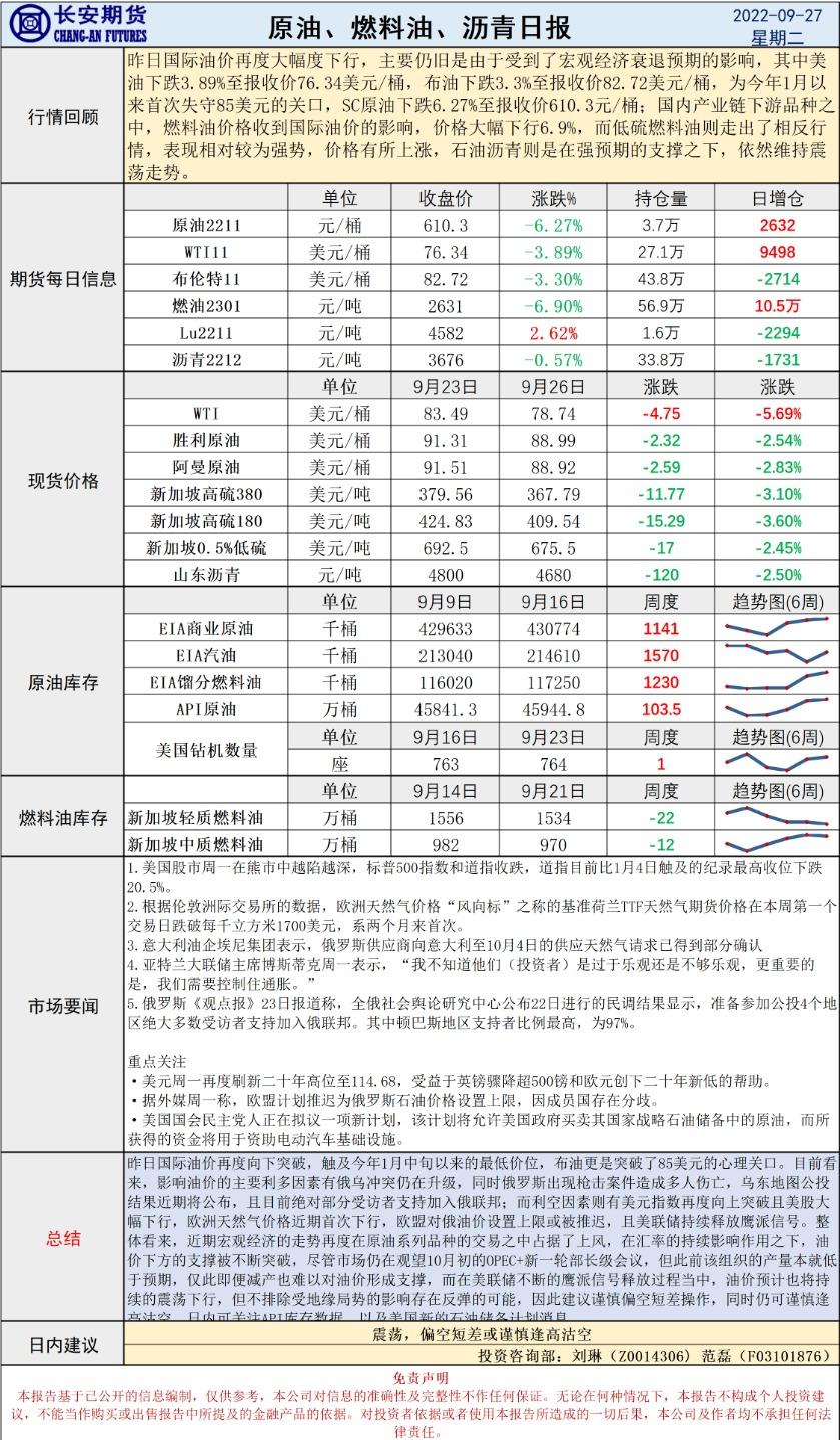 9月27日,长安期货发布原油早评,称油价向下突破至1月以来低位,欧盟推迟上限设置或持续利空,预测油价震荡运行,建议偏空短差或谨慎逢高沽空。